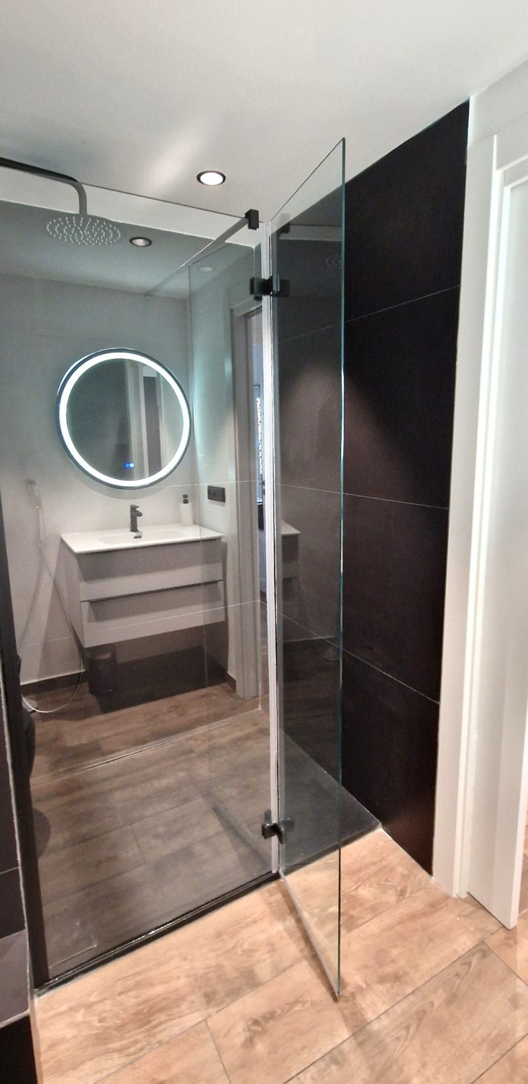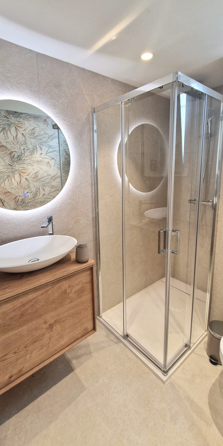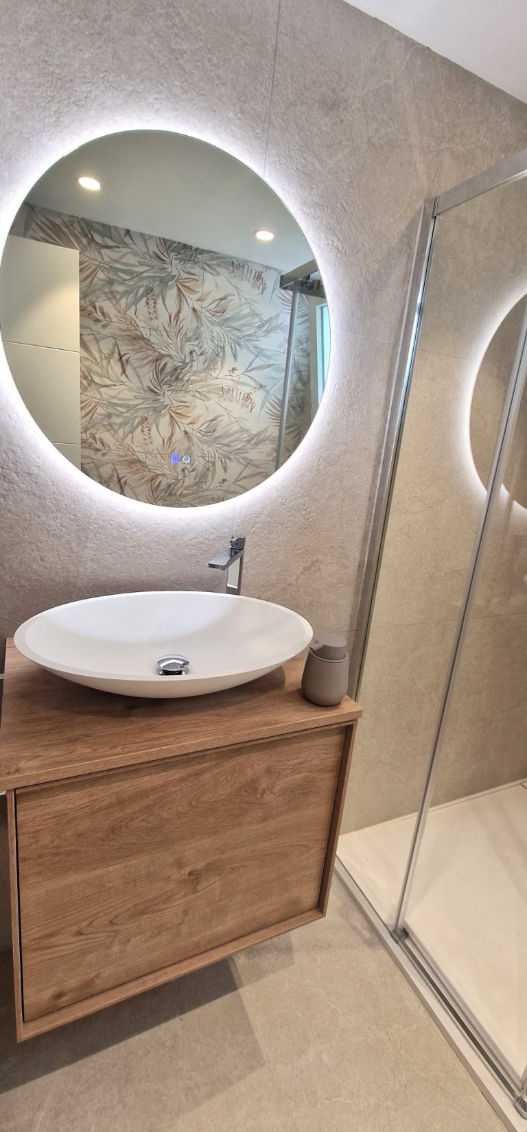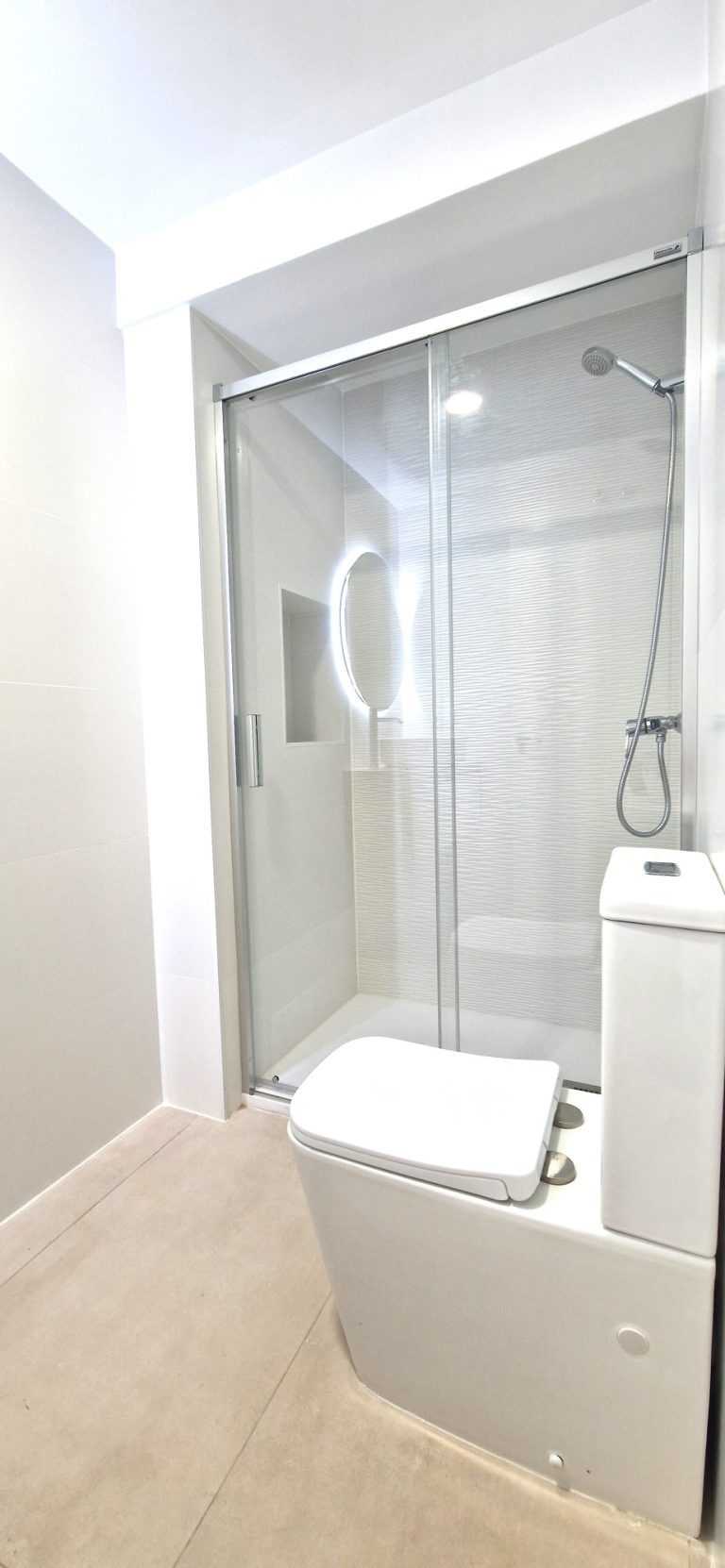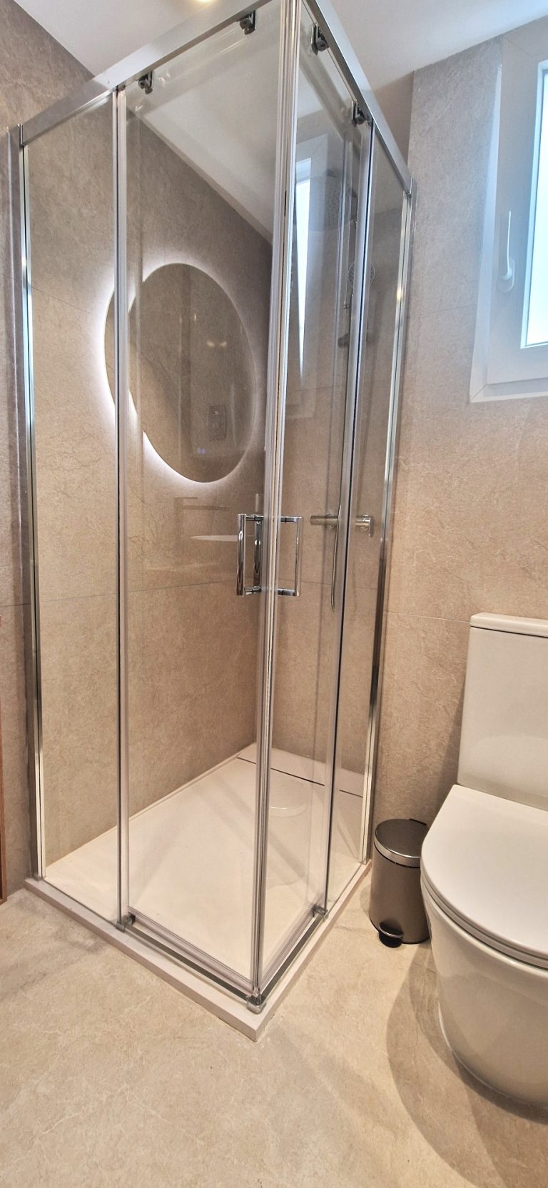 Un cuarto de baño con una gran ducha, espejo retroiluminado y quita vaho.