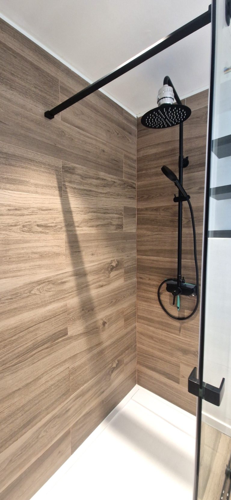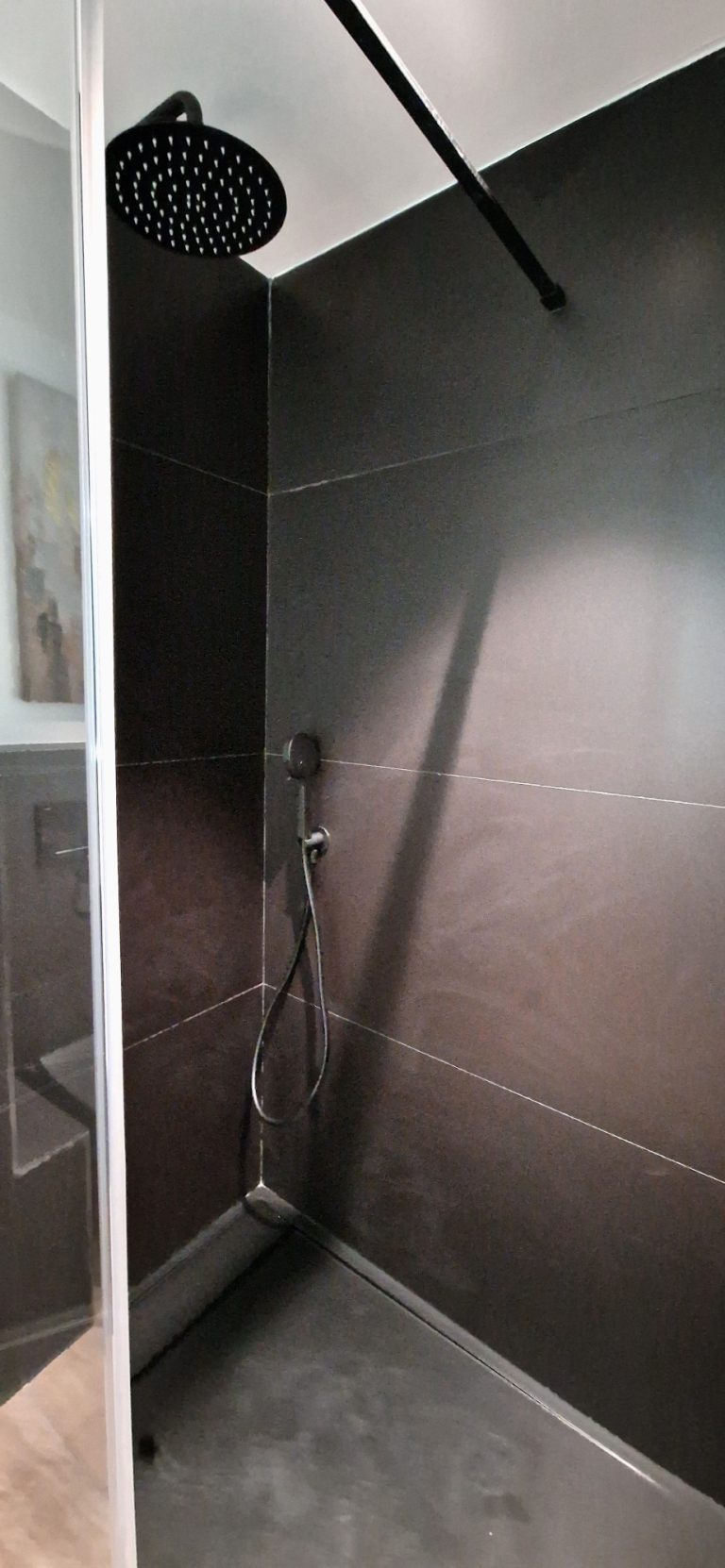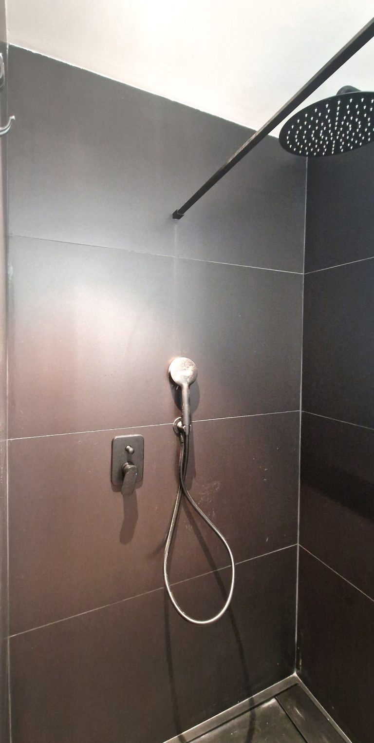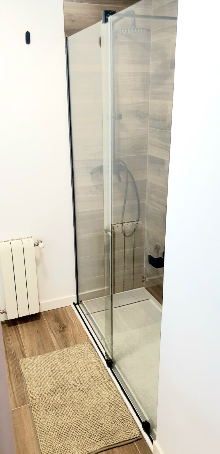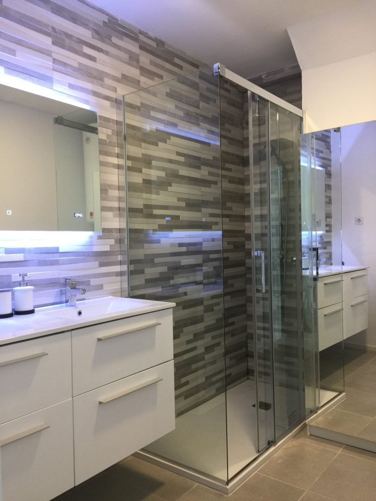 Un cuarto de baño con una gran ducha, espejo retroiluminado y quita vaho.