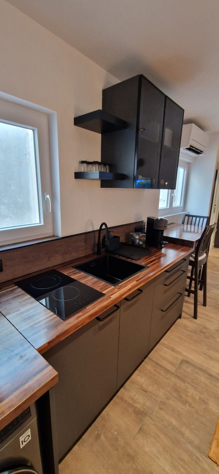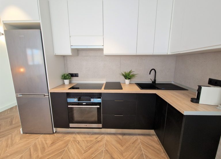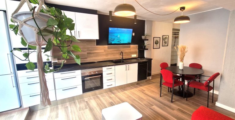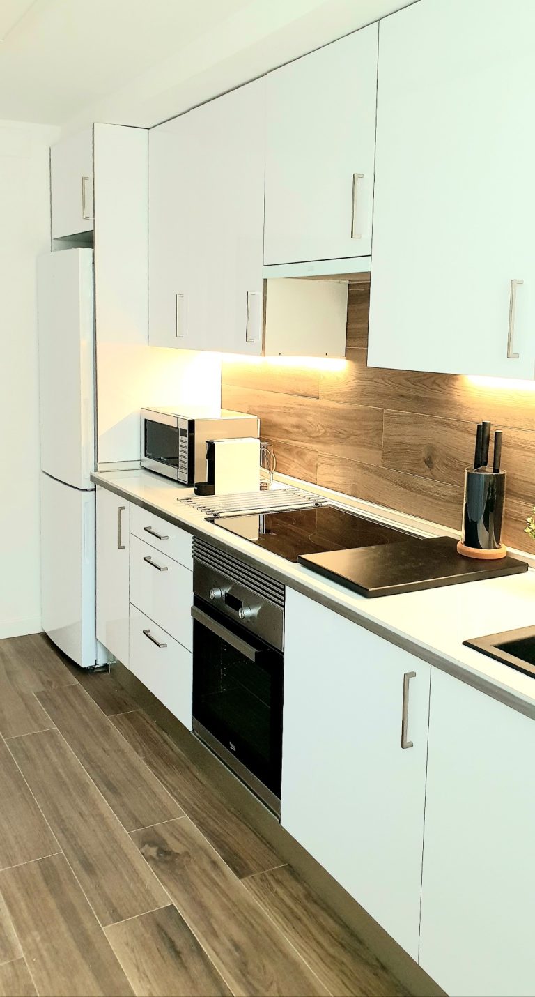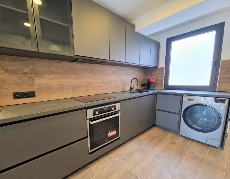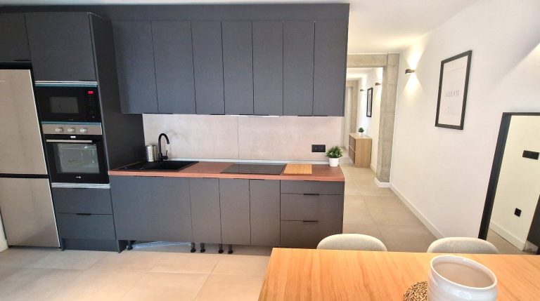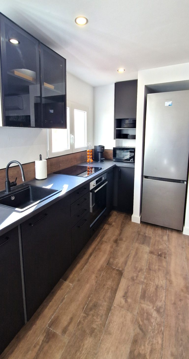 Cocina equipada con placa de inducción, nevera, lavavajillas y lavadora y todos los utensilios de cocina. También dispone de pequeños electrodomésticos como hervidor de agua, plancha, y cafetera Nespresso.