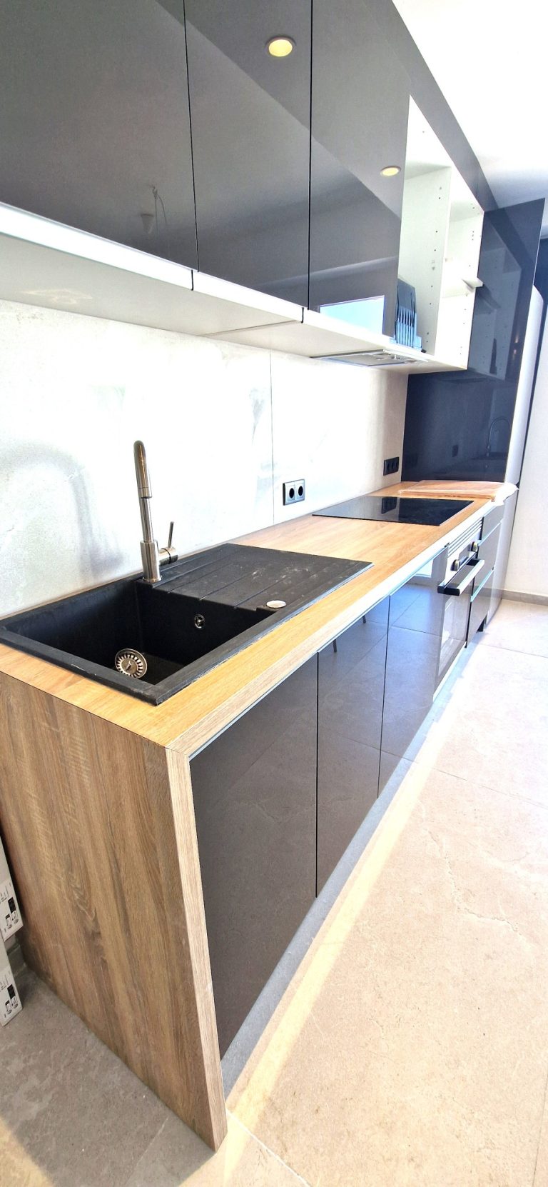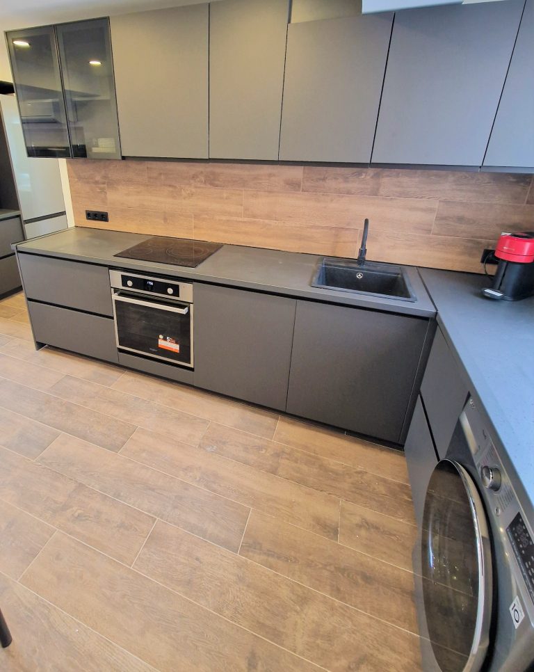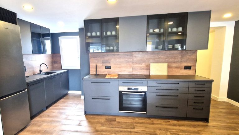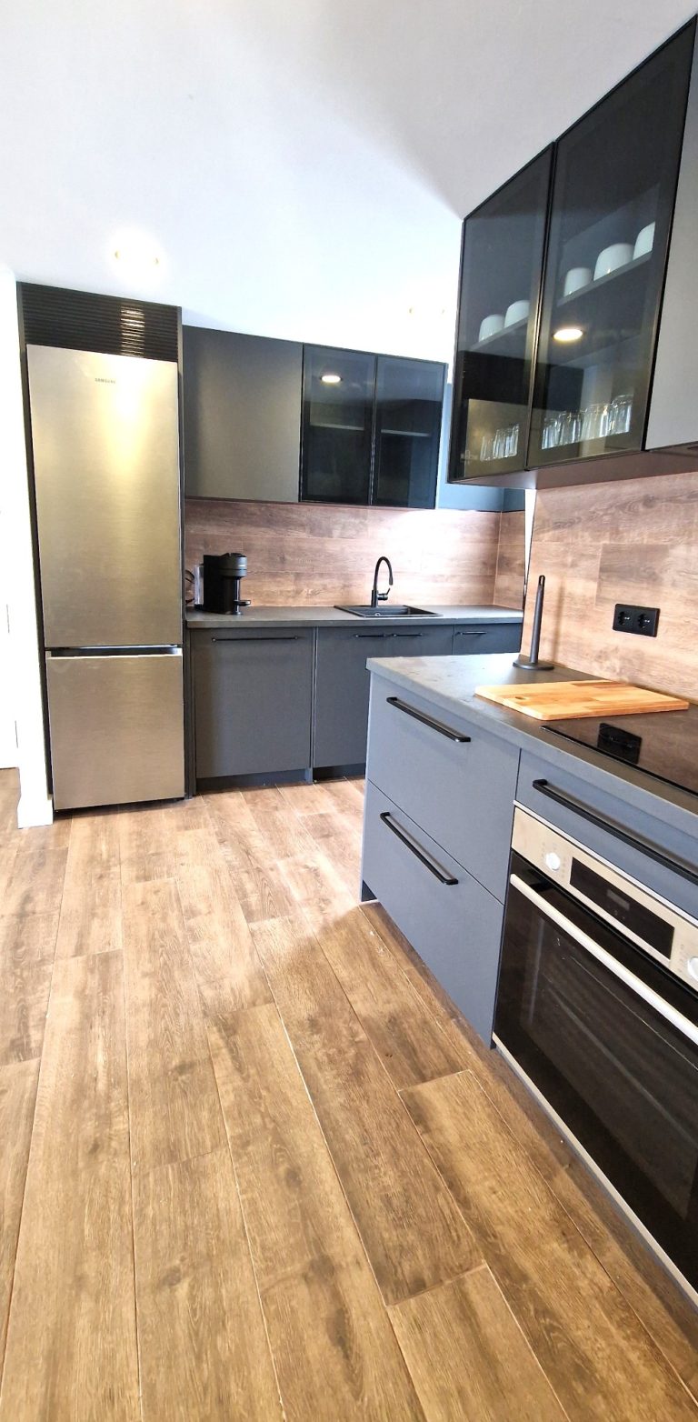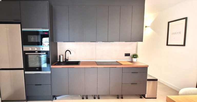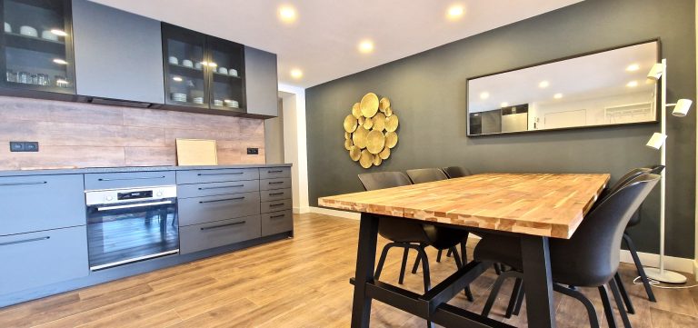 Cocina equipada con placa de inducción, nevera, lavavajillas y lavadora y todos los utensilios de cocina. También dispone de pequeños electrodomésticos como hervidor de agua, plancha, y cafetera Nespresso.
