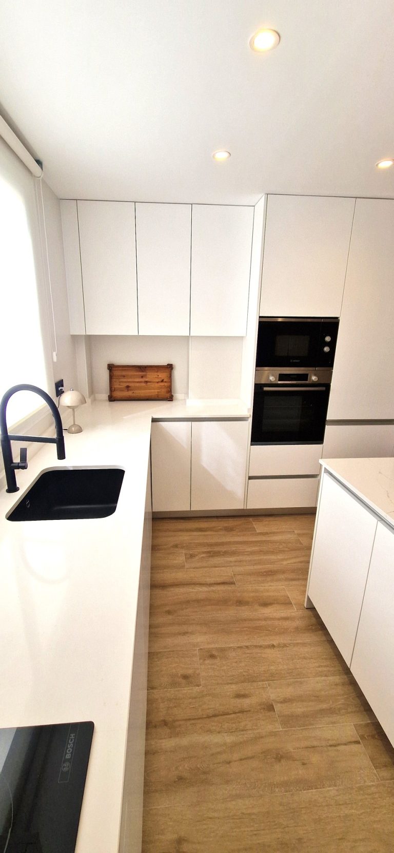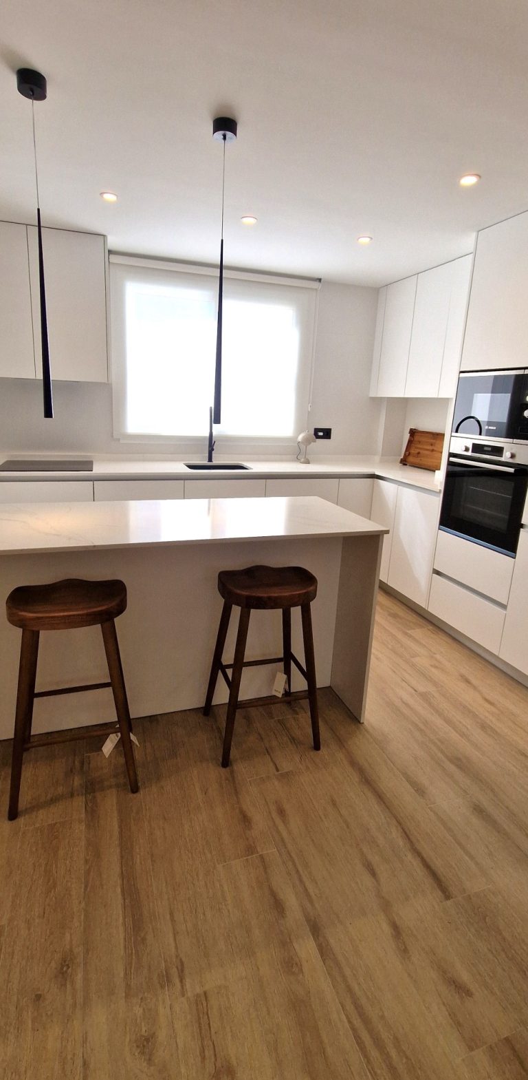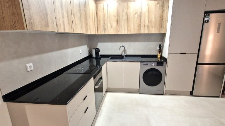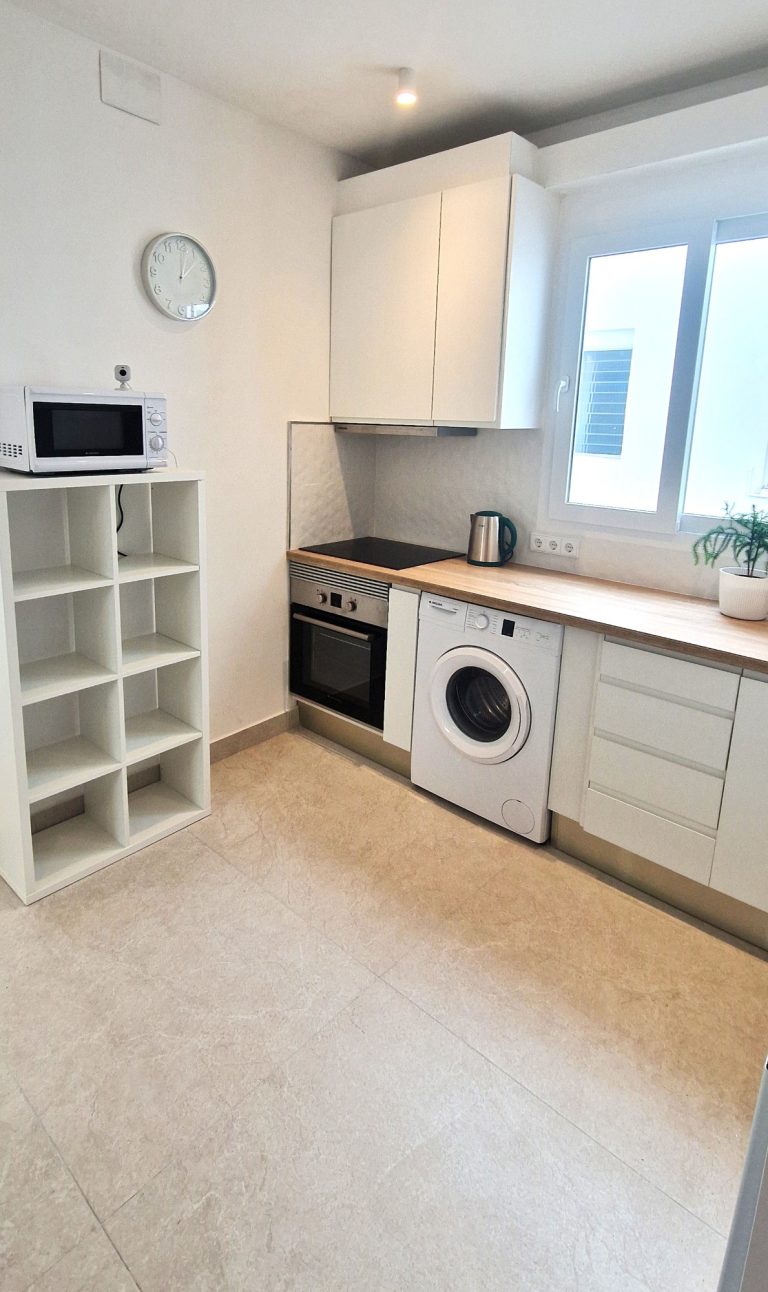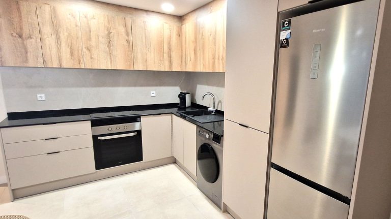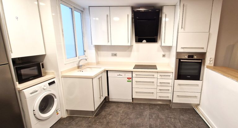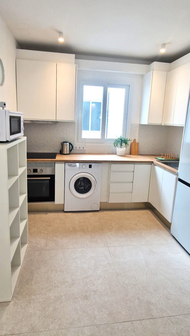 Cocina americana equipada con todos los electrodomésticos lavavajillas, lavadora, nevera, microondas, cafetera, horno, campana extractora y vitrocerámica.