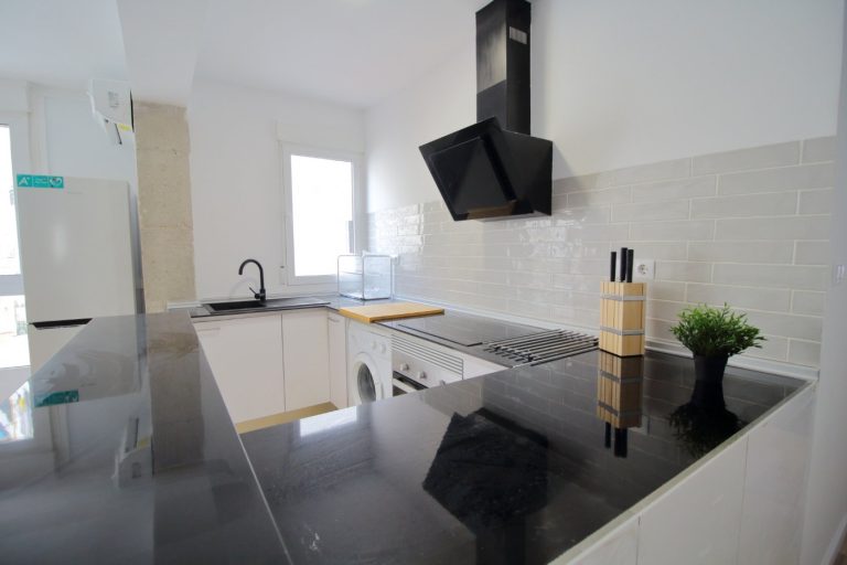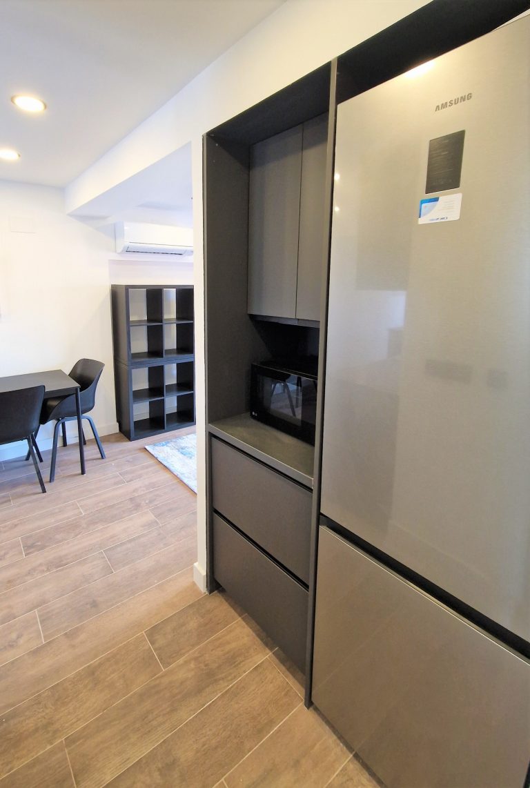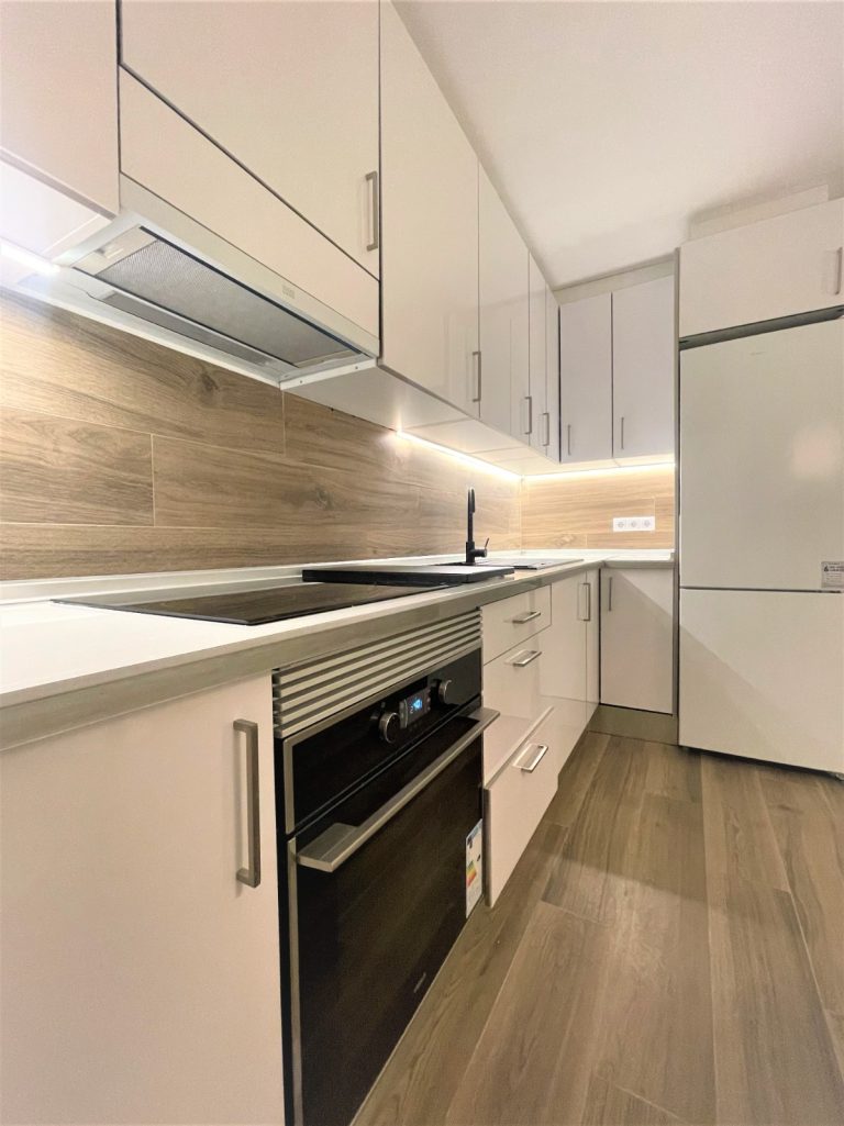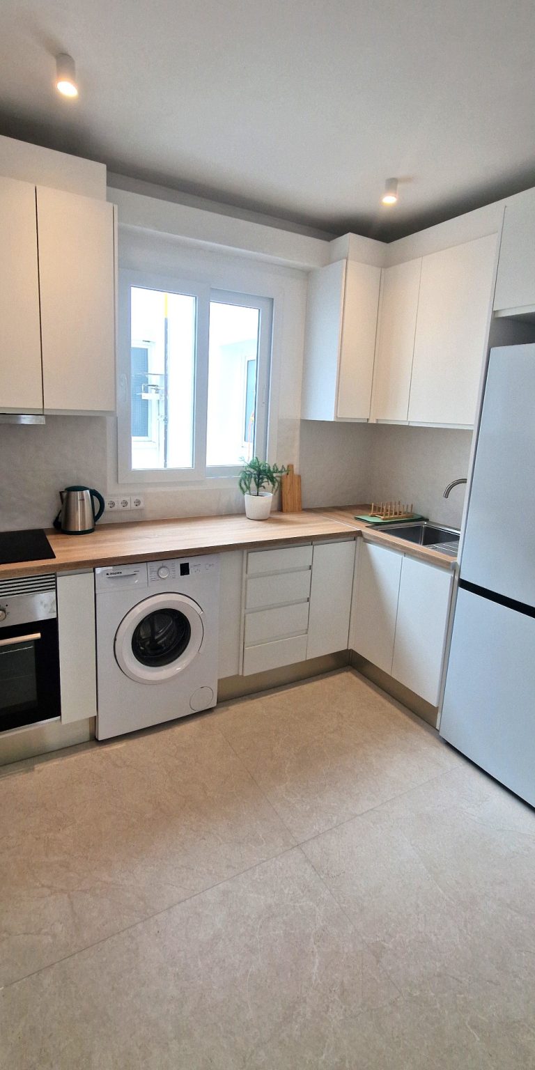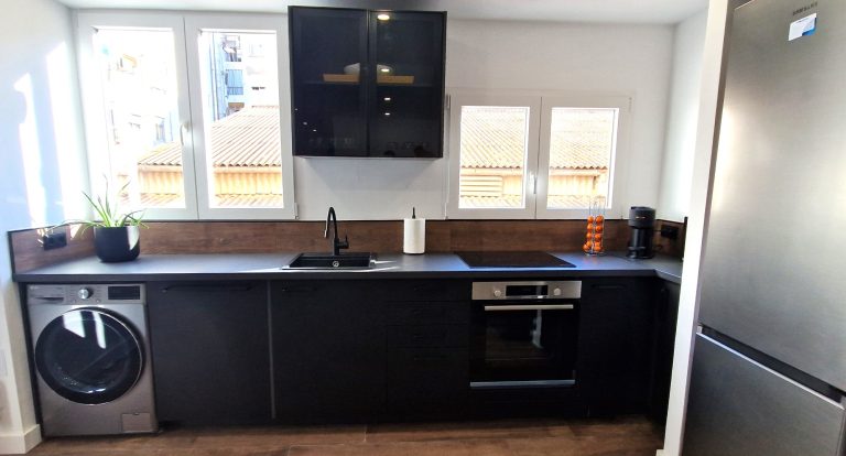 Cocina americana equipada con todos los electrodomésticos, nevera, lavadora, horno, campana extractora y vitrocerámica.