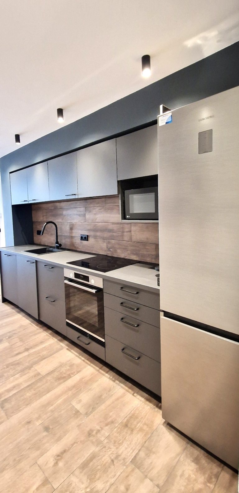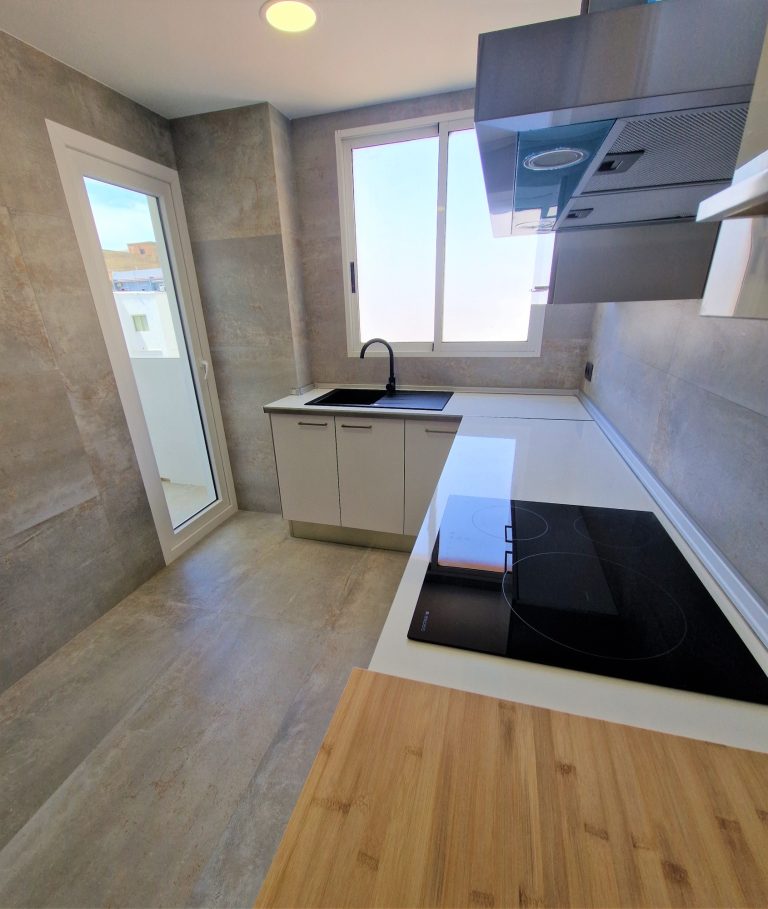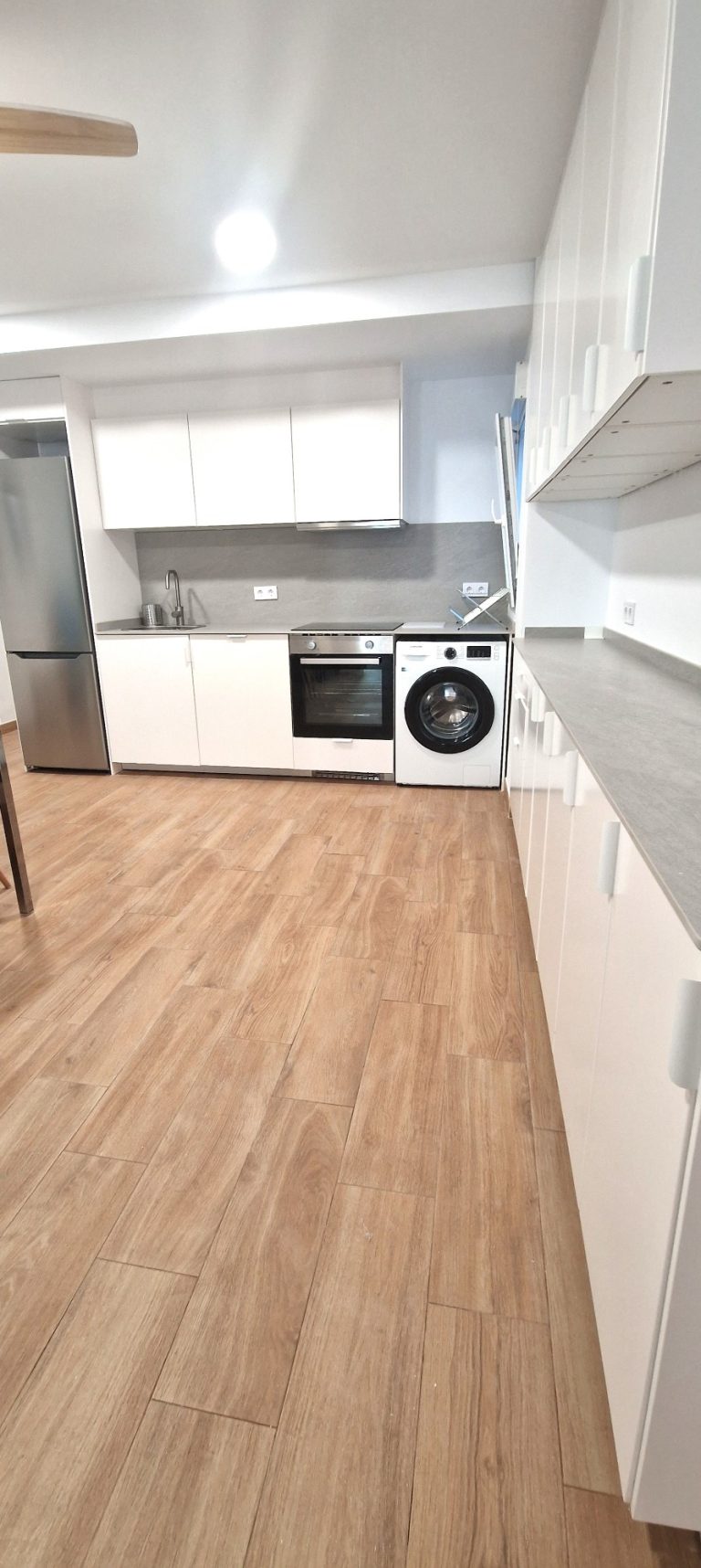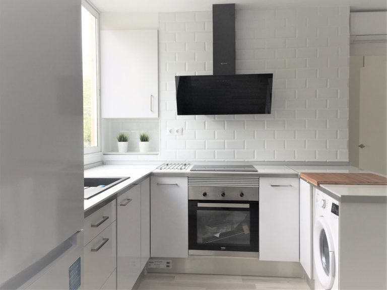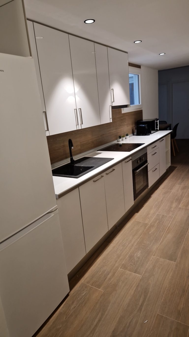 Cocina americana equipada con todos los electrodomésticos, nevera, lavadora, horno, campana extractora y vitrocerámica.