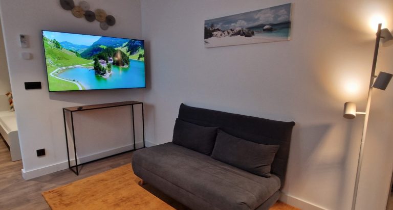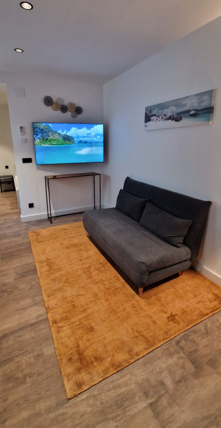 Un precioso salón con sofá-cama, aparato de AACC y smart tv de 55"