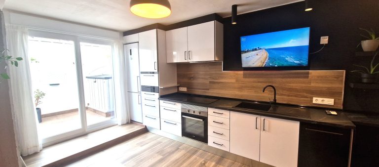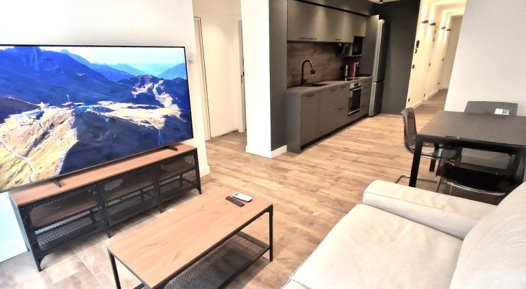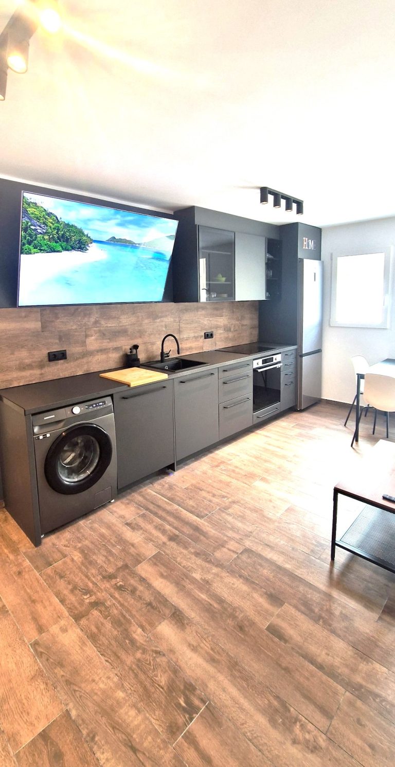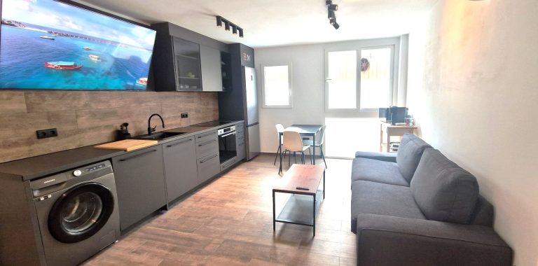 Un amplio y luminoso salón con sofá y tv, cocina americana equipada con todos los electrodomésticos lavavajillas, lavadora, nevera, horno, microondas, campana extractora y vitrocerámica.