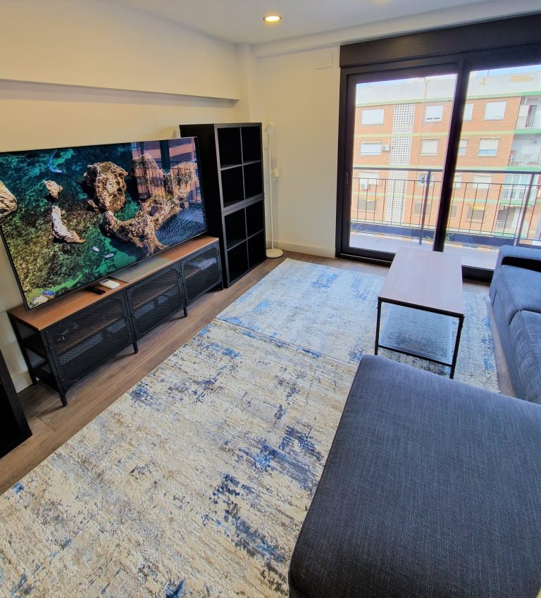 Un amplio salón con sofá, aparato de AACC y smartv de 55", el salón tiene una pequeña terraza exterior.