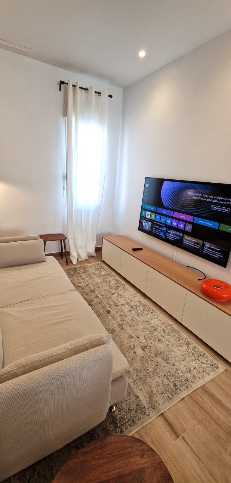 Un amplio y luminoso salón con sofá, aparato de AACC y smart tv de 75" Q-Led.