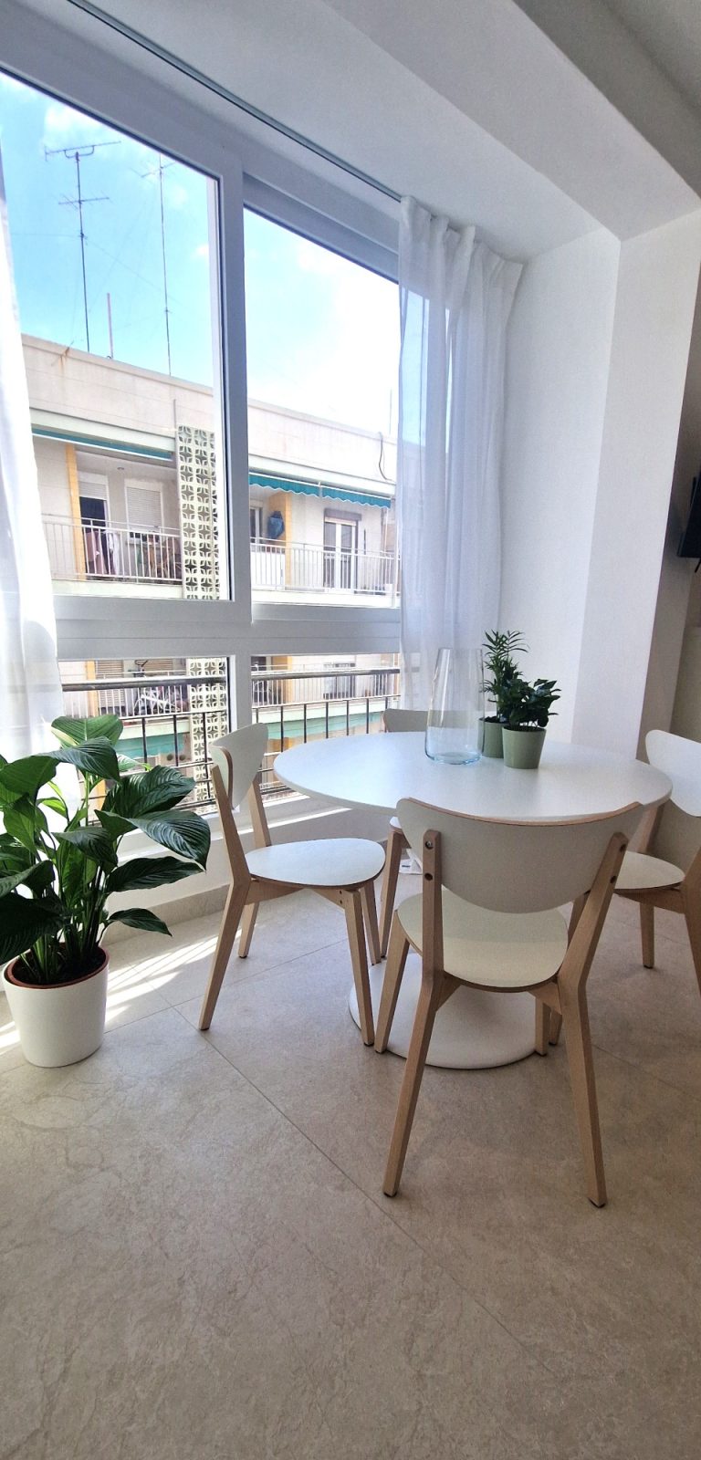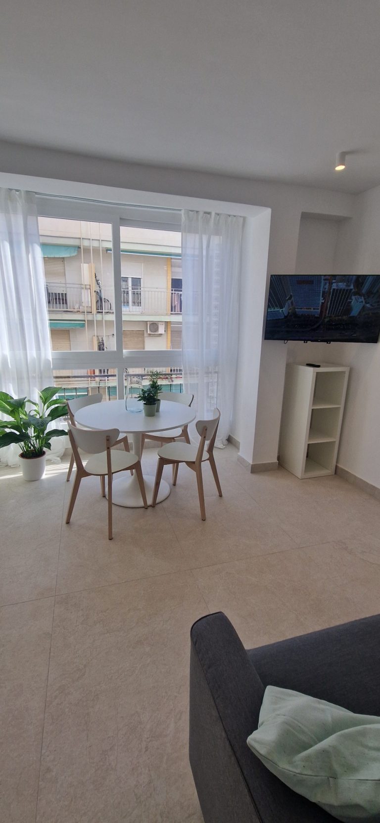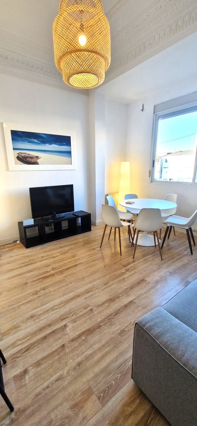 Un amplio salón con un gran ventanal, sofá, mesa y sillas, aparato de AACC y smartv de 43"