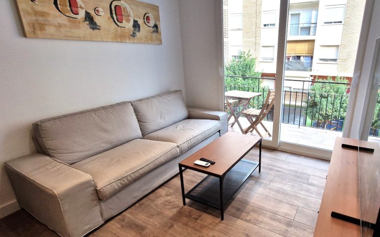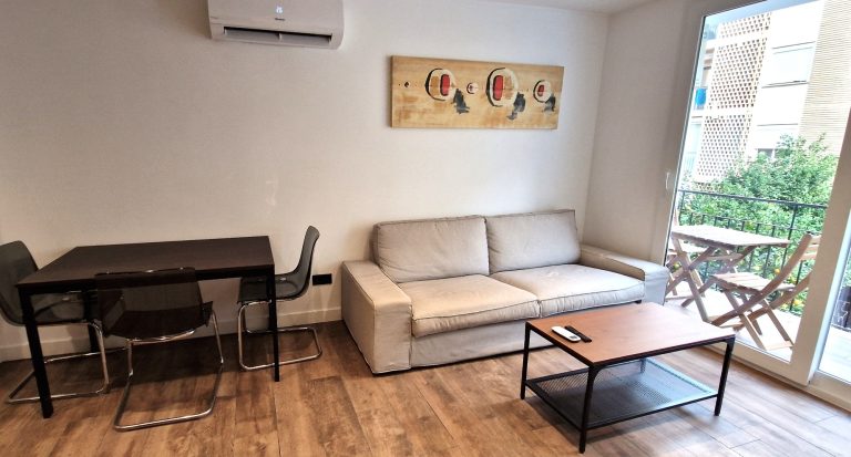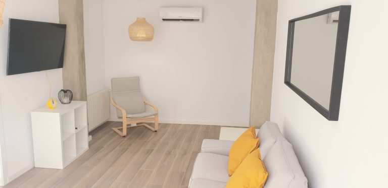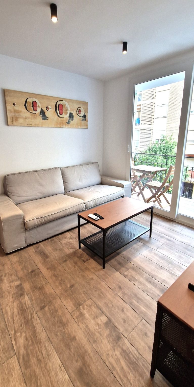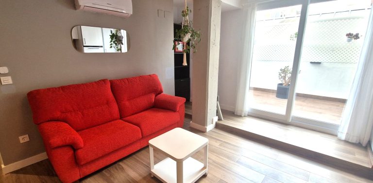 Un luminoso salón con sofá, aparato de AACC y smart tv de 55", el salón tiene una pequeña terraza exterior.