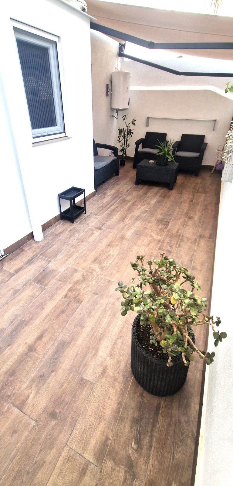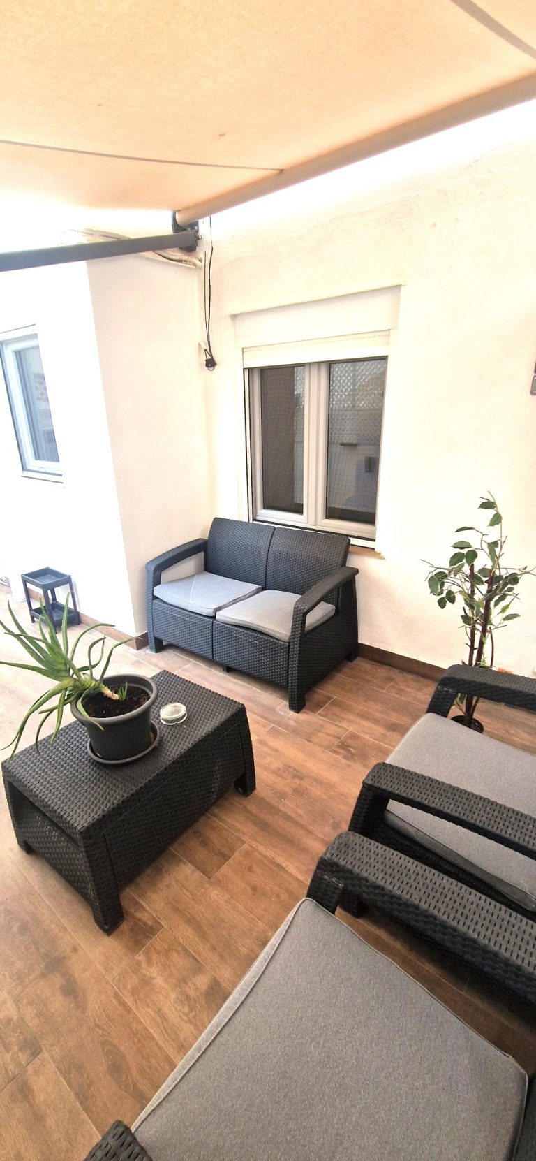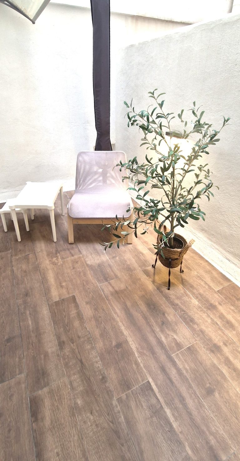 La vivienda cuenta con una acogedora terraza privada, el lugar perfecto para disfrutar de un desayuno al aire libre o de una copa después de cenar.