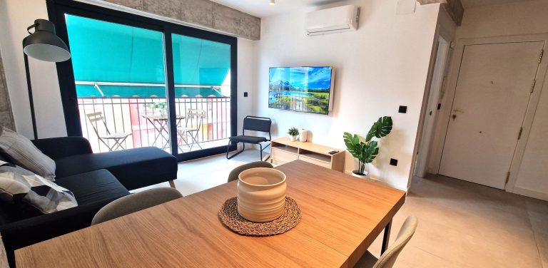 Este piso además cuenta con un amplio salón con sofá, smart tv de 55", aparato de AACC (frio/calor) y unas excelentes vistas desde las que se puede ver el mar.