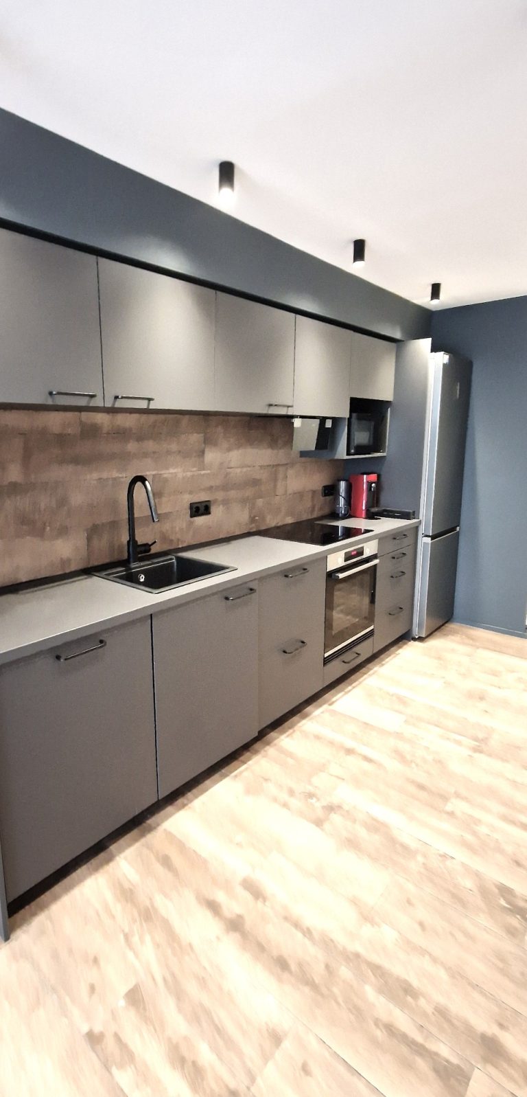 Cocina americana equipada con todos los electrodomésticos, nevera, microondas, cafetera, horno y vitrocerámica.