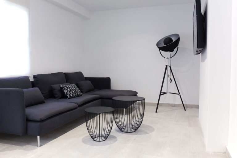 Un amplio y luminoso salón con sofá, aparato de AACC y smart tv de 75"
